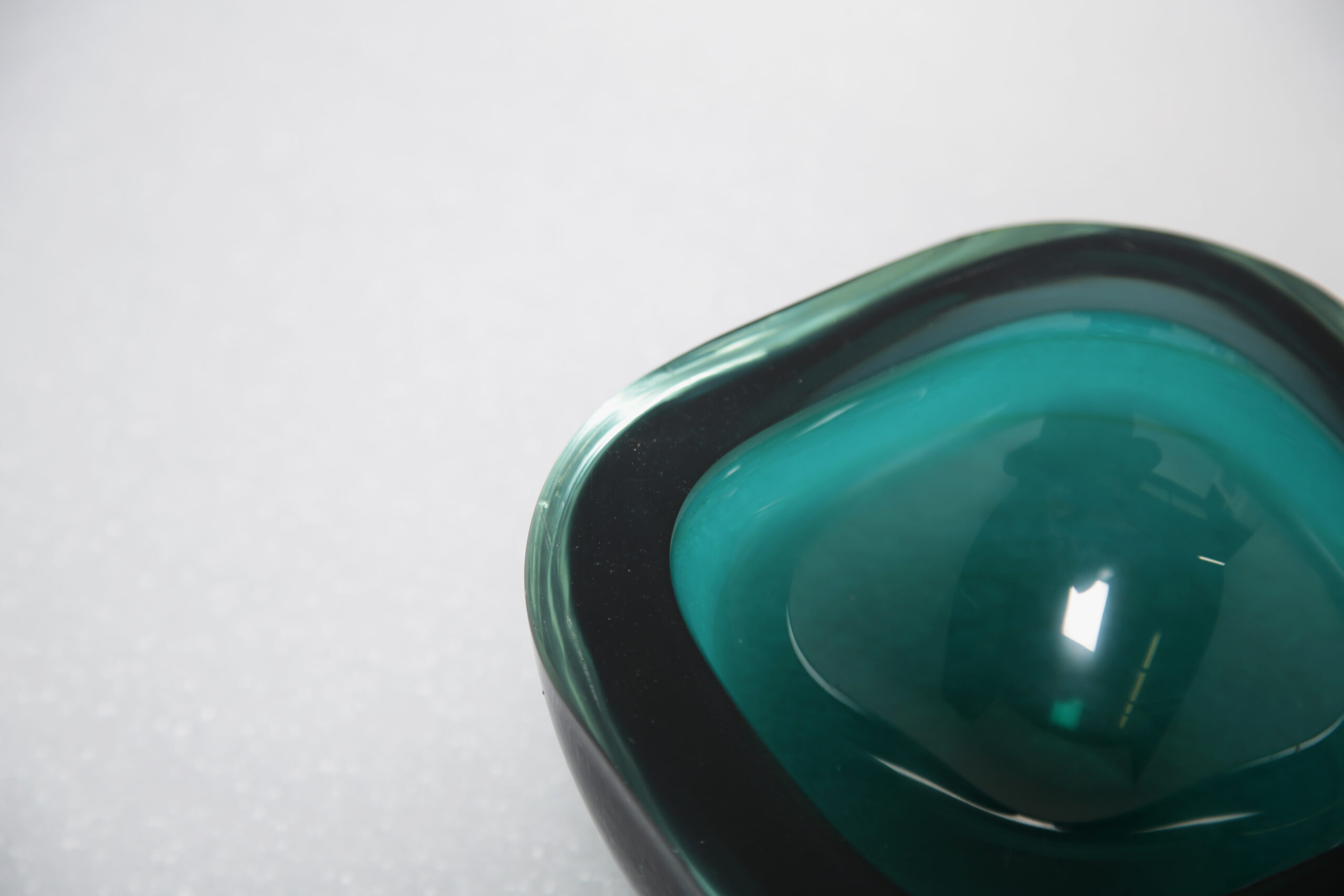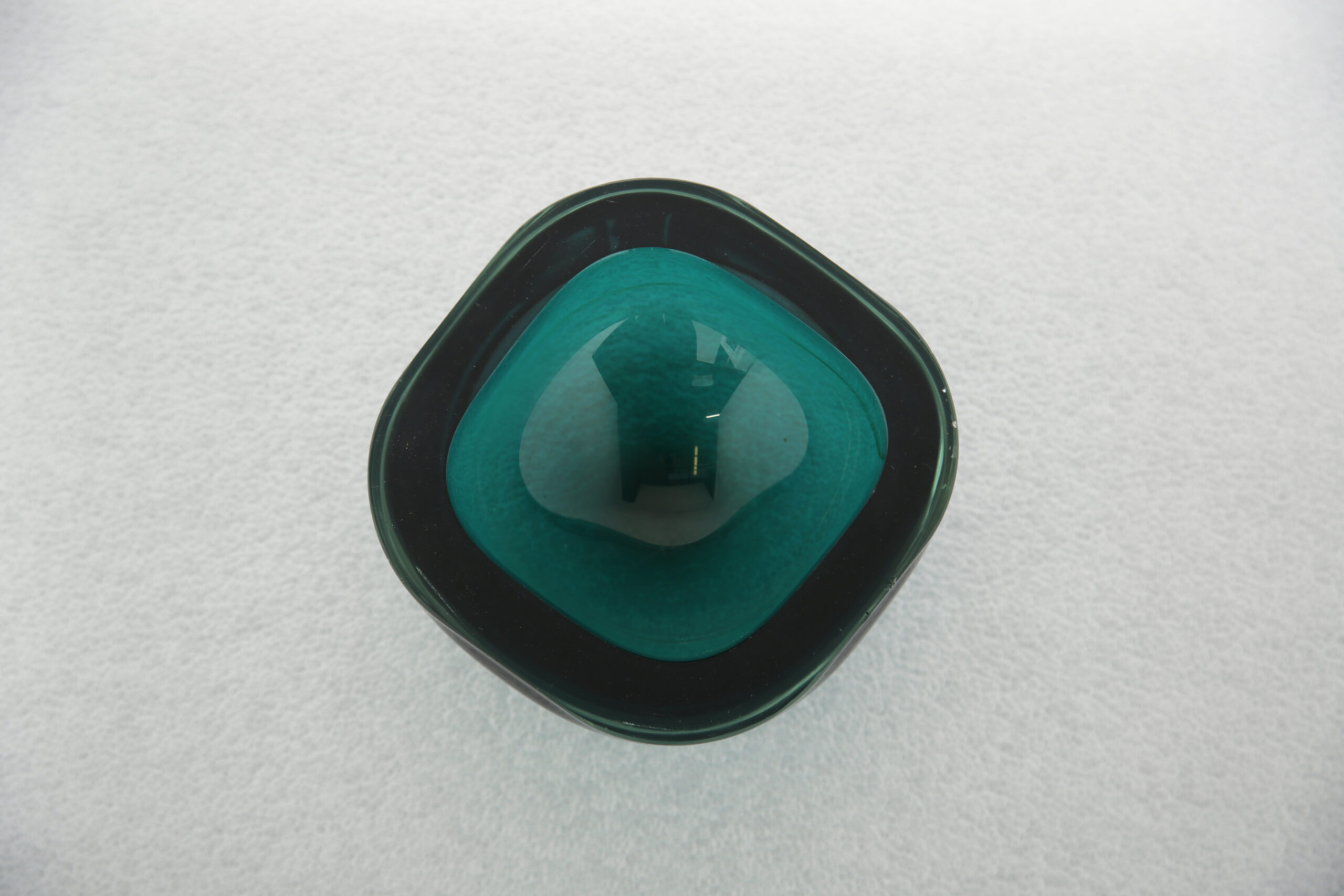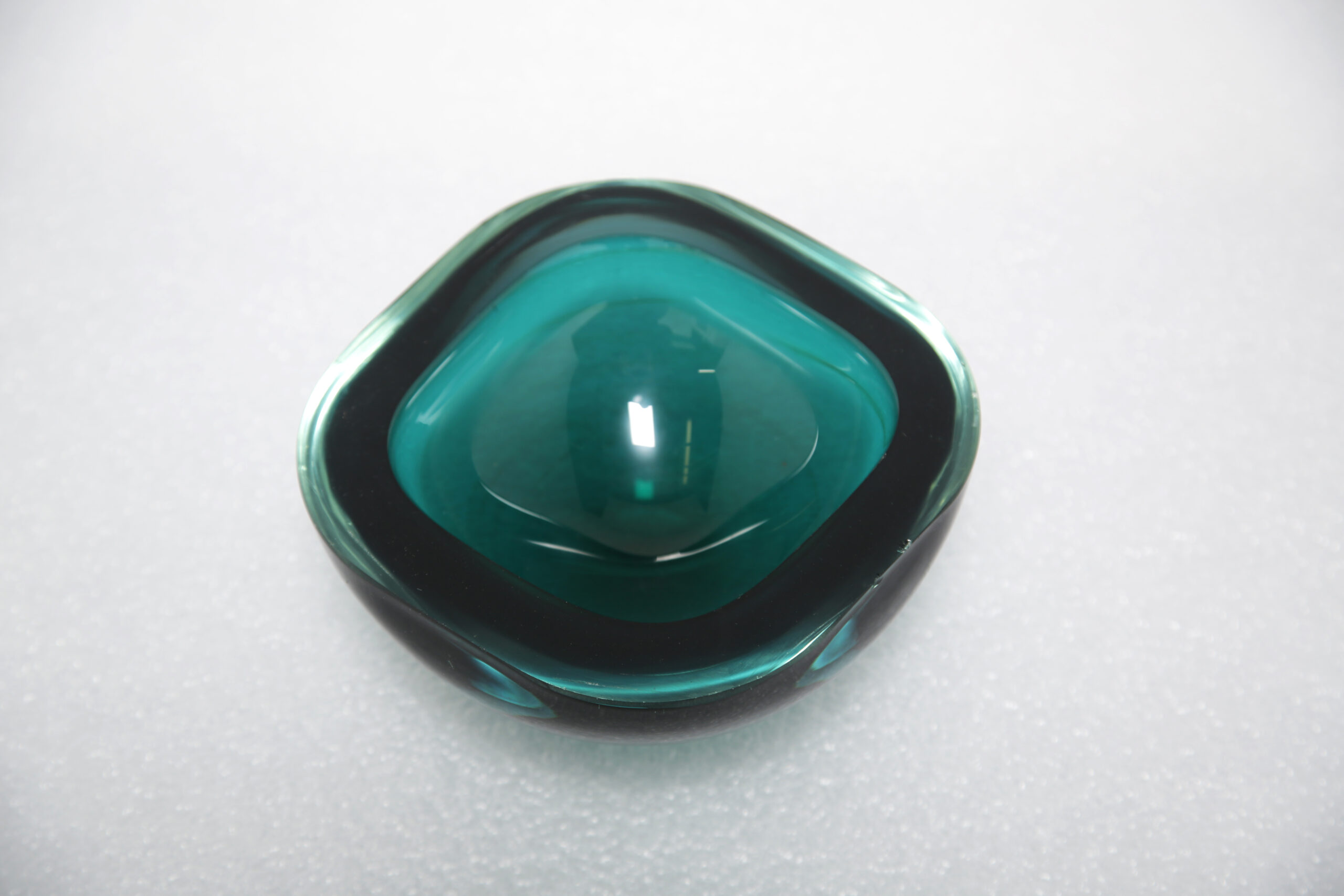 The rich teal color submerged within crystal-clear glass creates a mesmerizing visual effect, embodying the essence of the Sommerso technique. Distinctive, fluid and masterfully executed, this piece showcases the artistry of Archimede Seguso—one of Murano’s most revered glassmakers. Ideal as a functional bowl or displayed purely as a sculptural accent, it serves as a bold statement of mid-century Italian craftsmanship.