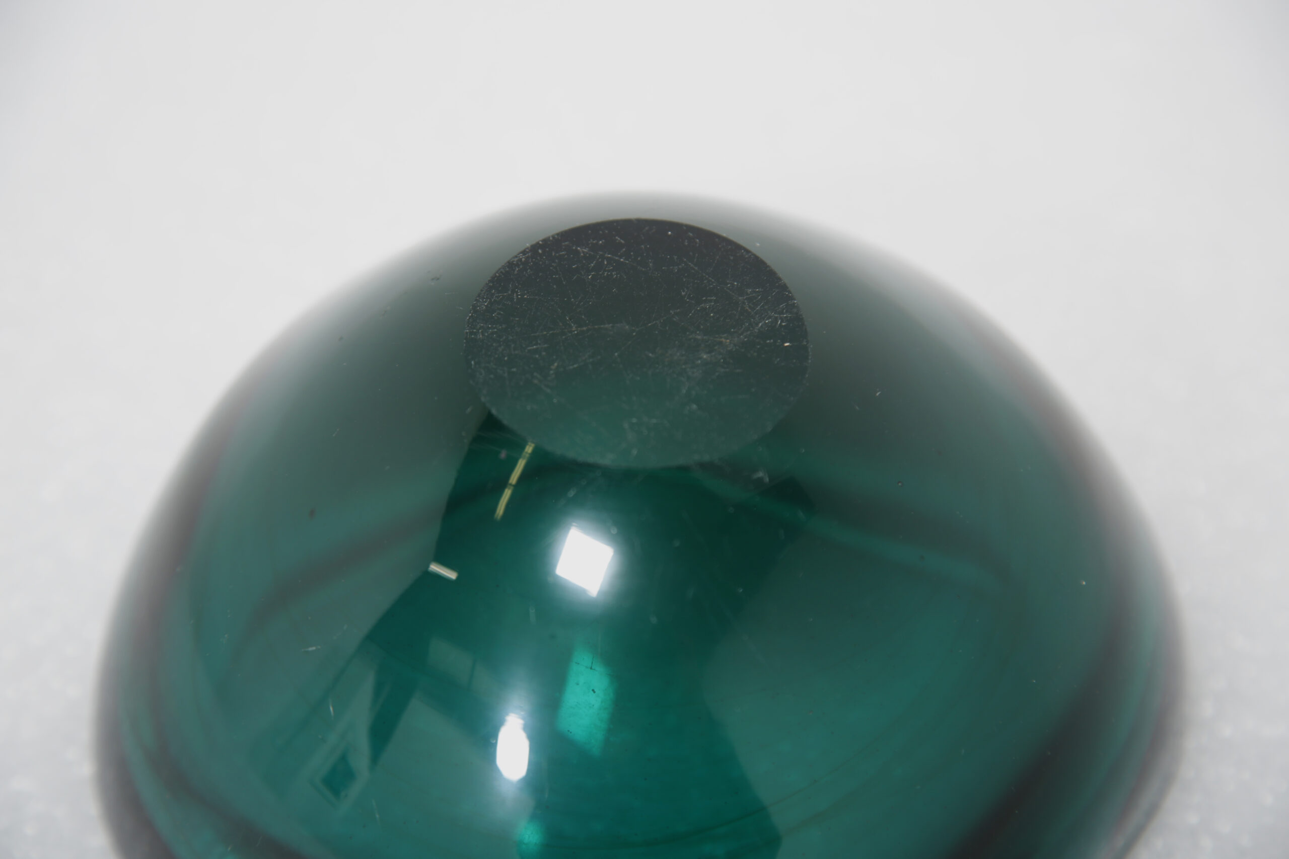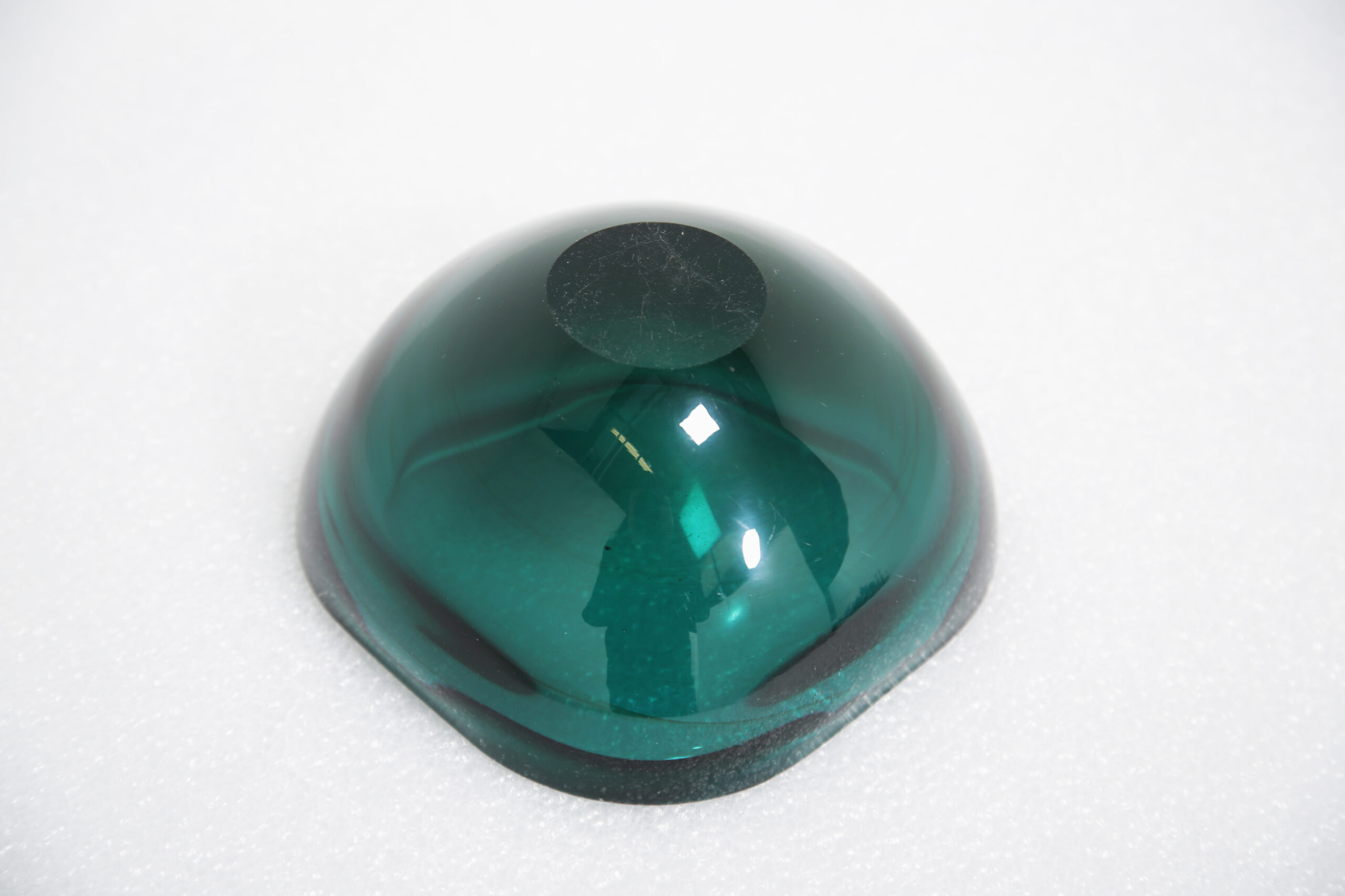 A striking Sommerso glass ‘geode’ bowl crafted by Archimede Seguso on the island of Murano, Italy, during the 1960s. This sculptural piece features a stunning teal-toned inner layer encased within clear crystal glass, achieved using the Sommerso (submerged glass) technique, which Seguso was renowned for mastering. The bowl’s form is organically shaped with softly contoured edges, creating a sense of depth and fluidity as light refracts through the layers. The semi-open geode profile provides both aesthetic impact and functional versatility, typical of Seguso’s innovative approach to mid-century Murano glassmaking. A highly collectible example, the bowl captures the elegance and intensity of color that defines the very best of Italian studio glass.
