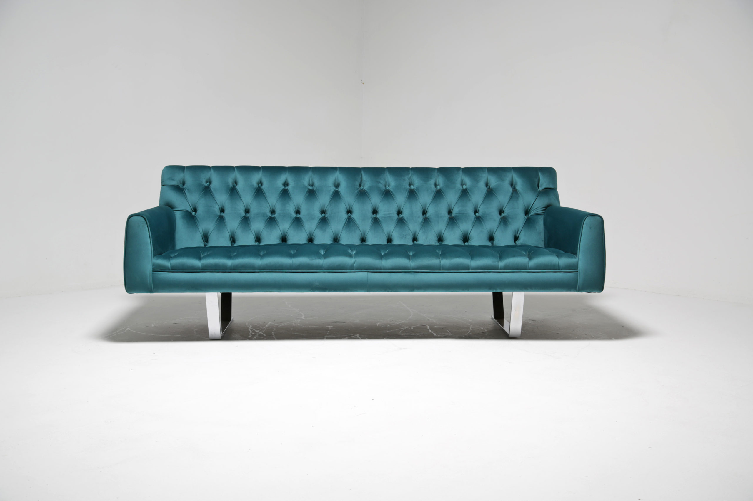 Vintage Teal Velvet Sofa – Very comfortable three seat sofa upholstered in a luxurious high-quality and durable teal colored velvet fabric. The material is soft and warm to the feel. This sofa is upholstered in a chesterfield style with deep buttoning on the seat and back. The sofa provides good support for the back and body. Featuring angled chrome legs, it provides stability to this sofa.
